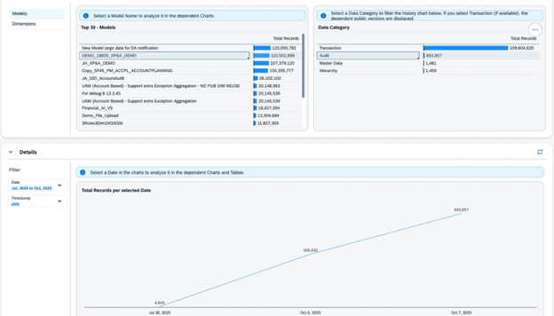 Data volumes (in planning models) grow rapidly and this story allows taking proactive steps before reaching certain system limits. Besides a number of key KPIs on overall system level, the story displays the top 30 models (and dimensions) based on total number of records. This includes a breakdown per model for data categories like master data, transactional data, audit data, etc. You can even drill-down to the version level for a data category if applicable. Furthermore the details section of this story provides the possibility to continuously monitor growing trends based on number of import jobs and publishing events per version for a certain time period.